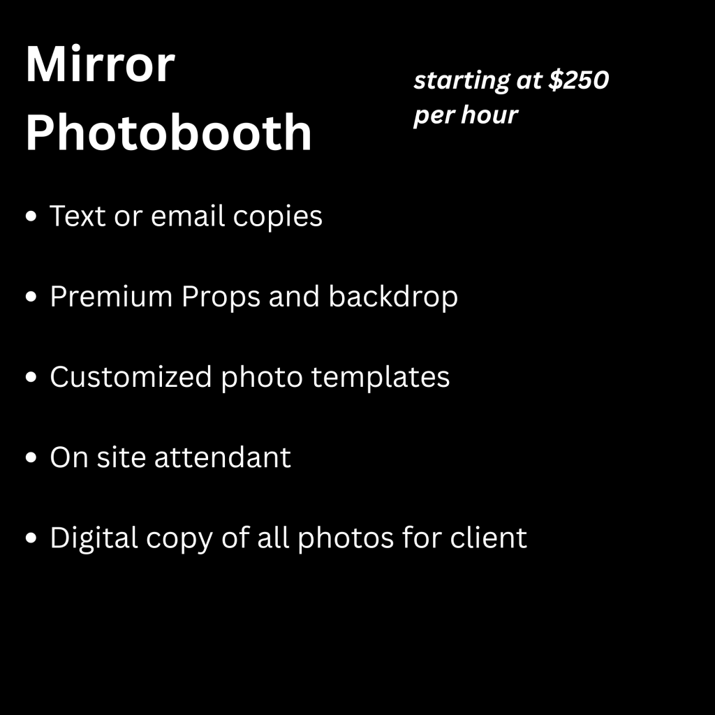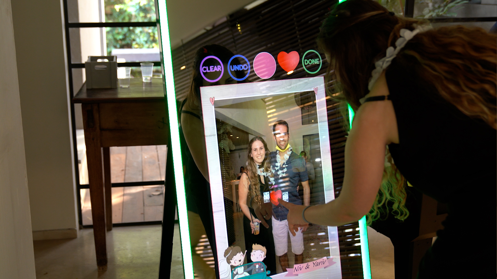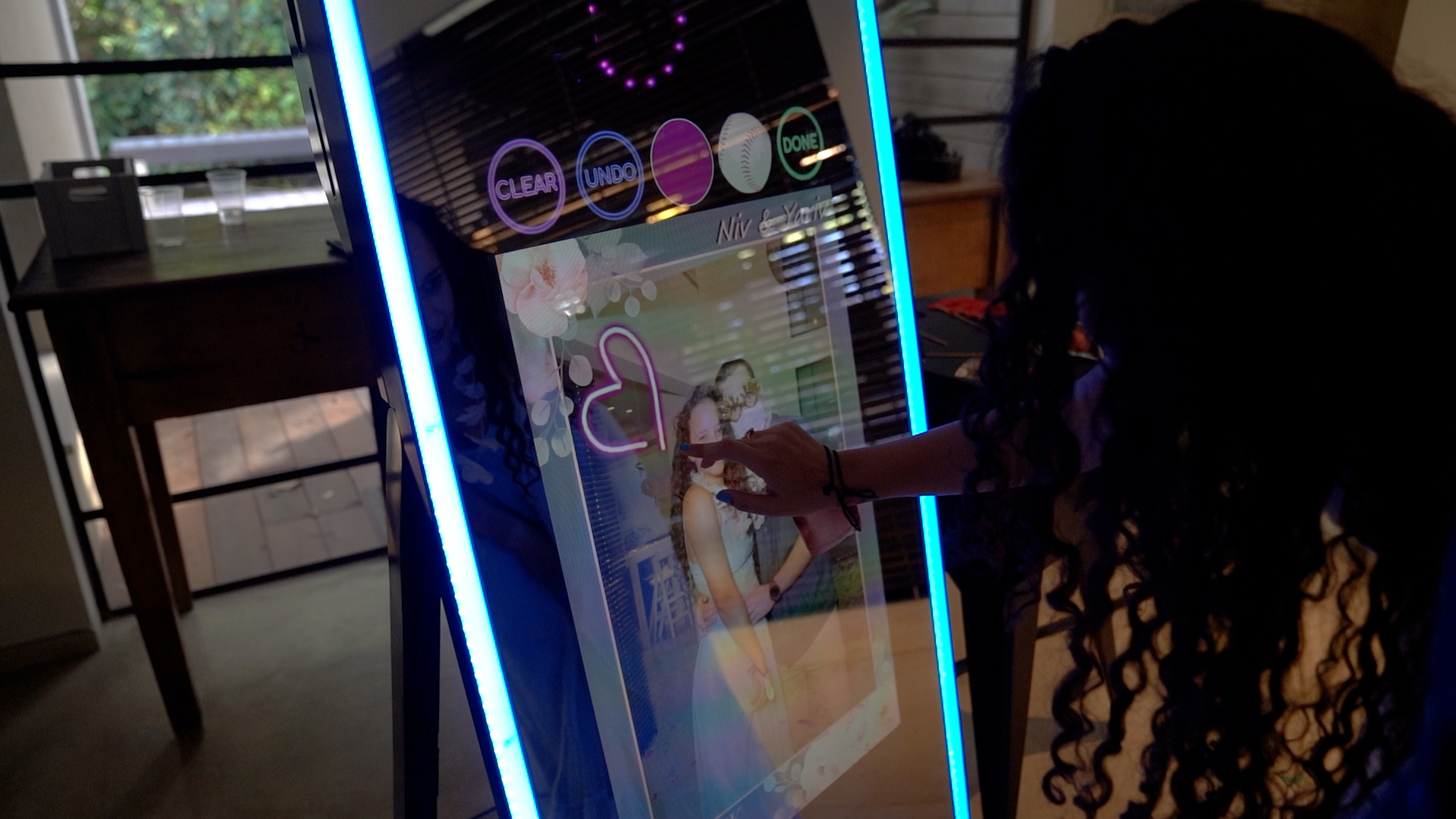 Elevate your event with our cutting-edge Mirror Air Booth — a sleek, full-length mirror infused with vibrant multi-LED lighting and interactive touch-screen animations. This elegant photo booth blends modern technology with stylish design, creating a fun, immersive experience your guests won’t forget. Whether it’s a wedding, corporate event, or party, booking the Mirror Air Booth adds a touch of glamour and excitement that makes every moment picture-perfect.